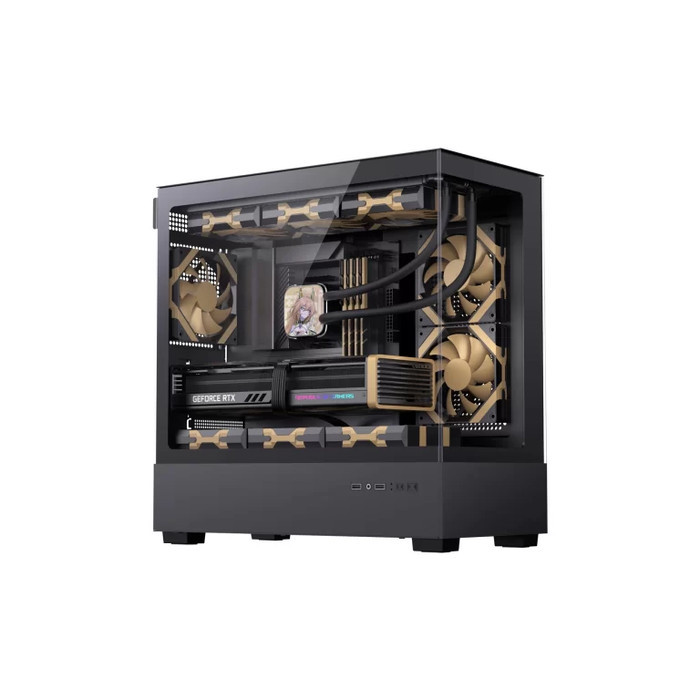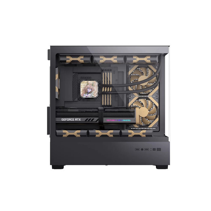Ukuran casingnya adalah 437 x 225 x 455 mm dengan jenis middle tower, cocok untuk motherboard M-ATX dan ITX. Dilengkapi dengan 5 PCI slot, serta drive bays yang mendukung 2 x 3.5″ atau 1 x 3.5″ & 1 x 2.5″. Untuk sistem pendinginan, casing ini mendukung beberapa fan, baik di bagian atas, belakang, clapboard, dan bawah, memberikan sirkulasi udara yang optimal. Anda juga bisa menghubungkan berbagai perangkat melalui port Type-C, USB 3.0, microphone, dan HD Audio yang ada di panel depan.